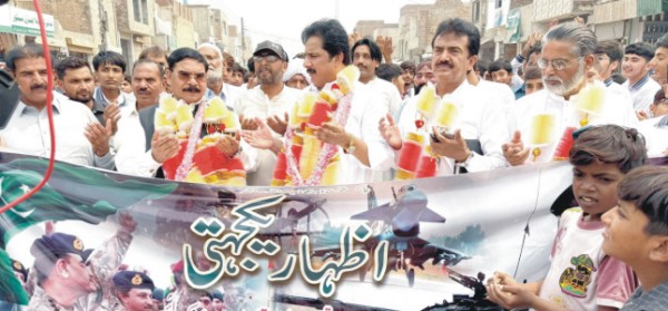 چک جھمرہ(نامہ نگار) بھارت کی جارحیت کا بھرپور جواب دیا جائیگا رات کی تاریکی میں کیئے گئے حملوں کا پاک فوج کے جوانوں نے بہت زبردست جرأت بہادری اور جواں مردی سے مقابلہ کرکے دشمن کو دندان شکن جواب دے کر ثابت کردیا ہے پاکستان کی افواج کا مقابلہ بزدل دشمن نہیں کرسکتا پاکستان کے عوام پاک فوج کے ساتھ کھڑے ہیں اور قربانی دینے کے لیئے کسی قربانی سے دریغ نہیں کریں گے۔ ان خیالات کا اظہار مسلم لیگی رہنما آزاد علی تبسم نے ریلی کے شرکا سے خطاب کرتے ہوئے کیا۔ افواج پاکستان کے ساتھ اظہار یکجہتی اور مودی سرکار کی مذمت کے حوالے سے نکالی گئی ریلی کے اختتام پر پاکستان اور پاک فوج کی سلامتی کے لیئے دعائیں مانگی گئیں۔ ریلی میں ہر طبقہ فکر کے لوگوں طالب علموں تاجروں سیاسی کارکنوں نے بھرپور شرکت کی۔ نکالی گئی ریلی چک جھمرہ کی ایک بڑی ریلی تھی ریلی کی قیادت پاکستان مسلم لیگ ن کے ضلعی جنرل سیکرٹری و سابق ایم پی اے ٹکٹ ہولڈر این اے 95 آزاد علی تبسم ‘ عطااللہ باجوہ افتخار گھمن ملک افتخار احمد ملک محمد اکرم سیٹھ محمد سلیم انصاری فاروق جنجوعہ ملک اللہ رکھا الفلاح سکول و کالجز کے چیف ایگزیکٹو احسان اللہ وڑائچ زاہد گایہ میاں اقبال مرزا بابر مرزا طارق محمود مرزا منظور احمد اکبر علی گولڑوی عابد مجید اعجاز احمد ججا ودیگر نے کی۔