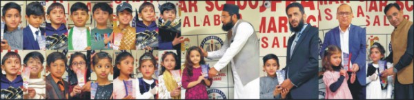 فیصل آباد ( سٹاف رپورٹر) صفہ گرائمر سکول میں سالانہ تقسیم انعامات کی پروقار تقریب کا انعقاد ،طلبہ اور والدین کی بھرپور شرکت۔ تفصیلات کے مطابق صفہ گرائمر سکول میں پوزیشن ہولڈر طلبہ میں انعامات تقسیم کرنے کیلئے منعقد کی گئی تقریب میں ڈائریکٹر لائیو سٹاک ڈاکٹر حیدر علی خان، ایڈمنسٹریٹر صفہ گرائمر سکول معظم علی خان، خطیب جامع مسجد قادریہ حافظ محمد اظہار الحق زاہدی اور نیوز ایڈیٹر” ڈیلی بزنس رپورٹ” ریاض ملک مہمان خصوصی تھے جنہوں نے طلبہ میں انعامات تقسیم کیے اور ان کی کارکردگی کو سراہا۔ انہوں نے اپنے خیالات کا اظہار کرتے ہوئے کہا کہ اس طرح کی تقریبات سے بچوں کی حوصلہ افزائی ہوتی ہے اور وہ مزید محنت کرتے ہیں۔ انہوں نے بچوں کو نصیحت کی کہ وہ دل لگا کر محنت اور لگن سے پڑھائی کریں اور اپنے والدین اور اساتذہ کی عزت و احترام کریں ،سکول کی انتظامیہ نے مہمانوں کا شکریہ ادا کیا اور تقریب کے کامیاب انعقاد پر خوشی کا اظہار کیا۔